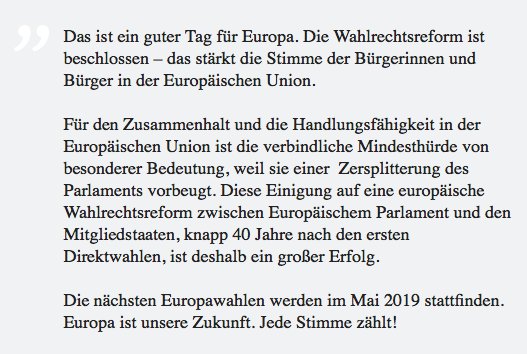 Heiko Maas bezeichnet es ja als “Das ist ein guter Tag für Europa. Die Wahlrechtsreform ist beschlossen – das stärkt die Stimme der Bürgerinnen und Bürger in der Europäischen Union.”