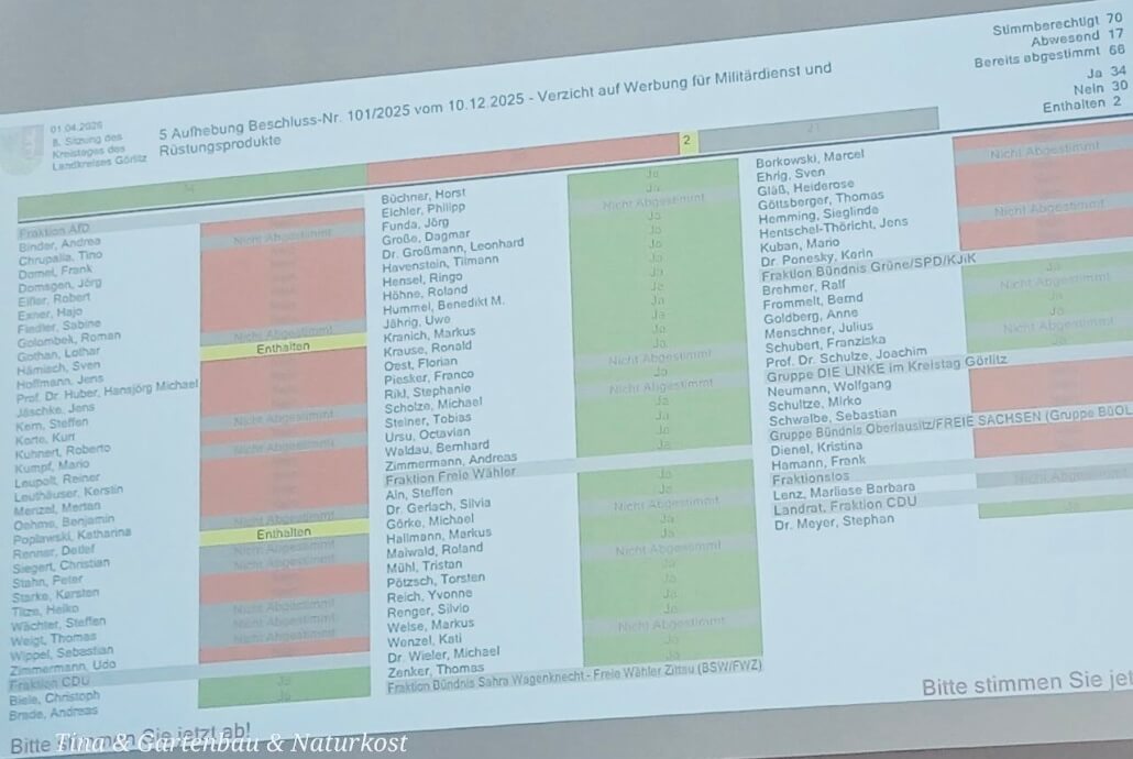 Zwei Mal hat eine deutliche Mehrheit der Kreisräte im Kreistag des Landkreises Görlitz eine Friedensresolution beschlossen, welche u.a. ein Werbeverbot für Bundeswehr-Aufrüstungskampagnen enthält. Landrat Meyer ging dagegen vor und auf seine Beschwerde hin hat die Landesdirektion den Beschluss erneut aufgehoben – damit musste die Vorlage, die den Görlitz zum “Landkreis des Friedens” ausruft heute ein drittes Mal in den Kreistag. Nachdem die vergangenen Abstimmungen denkbar knapp verliefen, fehlten heute ganze 10 (!) Abgeordnete der AfD-Kreistagsfraktion. Und weitere 2, die sich wohl nicht sicher sind, für oder gegen den Landkreis des Friedens zu sein, enthielten sich. Das Ergebnis: Mit 34 zu 30 Stimmen hat Landrat Meyer nun seine Mehrheit, um den Beschluss aufheben zu lassen. DAS ist wahrlich keine Sternstunde der Oppositionsarbeit, eine so wichtige Sitzung in dieser Größenordnung einfach sausen zu lassen. Die Kreisräte von Bündnis Oberlausitz / FREIE SACHSEN waren bei diesem wichtigen Thema natürlich vollständig abwesend. Leider fehlten nicht nur ehrenamtliche AfD-Mitglieder, sondern auch bekannte Funktionäre, etwa der Landtagsabgeordnete Sebastian Wippel oder der Bundesvorsitzende Tino Chrupalla. Das zeigt einmal mehr: Auf Bundesebene für eine Oppositionspartei wie die AfD zu stimmen, mag nachvollziehbar sein – auf kommunaler Ebene gibt es aber viele Initiativen, wie eben auch die FREIEN SACHSEN, die sich den Themen oft gründlicher annehmen können, weil sie eben keine Verpflichtungen aus höheren politischen Gremien haben. Und ihre ganze Energie in die Arbeit vor Ort stecken können. Es schadet nicht, das bis zur nächsten Kommunalwahl im Hinterkopf zu behalten!